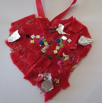 2. Cover the cardboard heart(s) in glue and stick felt scraps, foil, sequins and other decorations on with PVA glue.