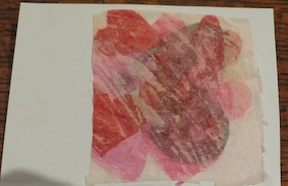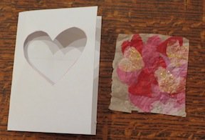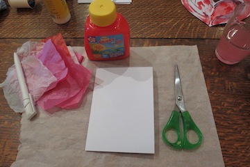 You will need: 1 piece of card stock (white, red or pink) Scraps of coloured tissue paper in Valentine colours PVA glue and paintbrush Scissors/and or heart stamp |