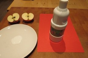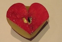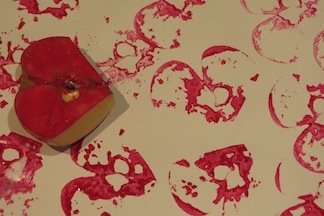 1. Start by cutting one apple in half and shaving the bottom two edges off to make a heart shape (see picture below). Put some paint on a plate and using a paintbrush spread it across the apple.