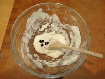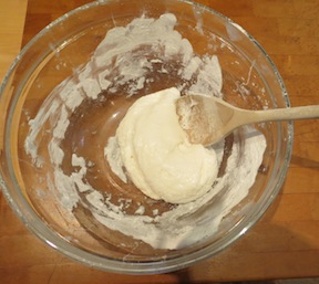 4. Sift in the flour, cinnamon and ginger and bring together with a wooden spoon.