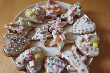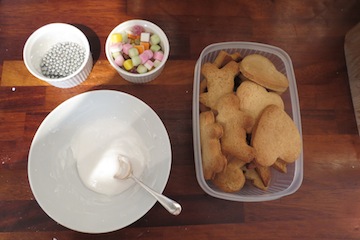 9. Now for the decoration! Mix 1 cup of icing sugar into a bowl and add 4 tsp of water (no more). Mix until a thick paste. Spread the icing onto the cookies and sprinkle decorative sweeties ontop.