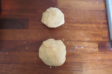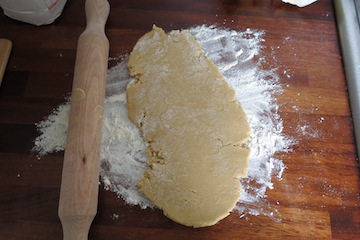 6. Sprinkle some flour a work surface and roll out one ball of dough to about 2.5cm thick) - this does not really matter. Just make sure its not so thin that you can't lift the shape off the table onto the tray!
