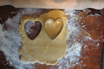 7. Take a cookie cutter and cut out different shapes. Gather up the scraps and mould them into a ball to roll out again. Once you have used the first ball of dough up get the second one out to use.