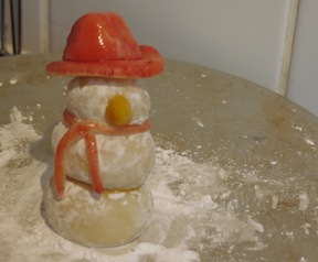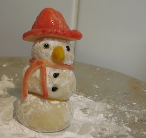 Scarf: Roll a long (about 10cm) piece of marzipan, rolling it to get thinner from the middle outwards.