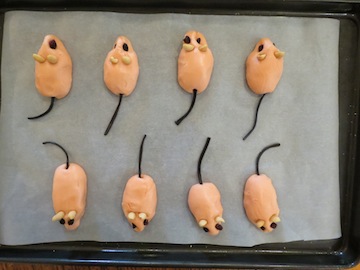 7. Finally, gently press two currents above the noise to make eyes, two peanut halves above the eyes for ears and a liquorice string for the tail. Let them dry out, preferably overnight, on the baking tray.