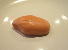 Hat: Roll out a piece of marzipan the shape and size of a fruit pastel. To do this make a small ball, press down the top and bottom, and gently flatten the sides.