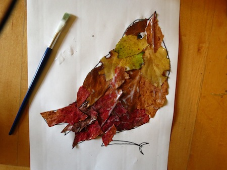 TIP: Encourage your kids to spot how the different shapes of the leaves might fit into the outline. You can see in our picture that we ended up using the tips of leaves for the tail and the rounded sides of leaves for the breast and head. We also ripped leaves up where necessary.