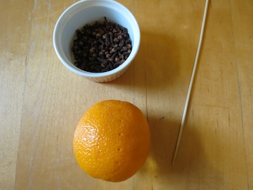 1. Use the skewer to make small holes into the orange where you want the cloves to go.