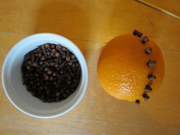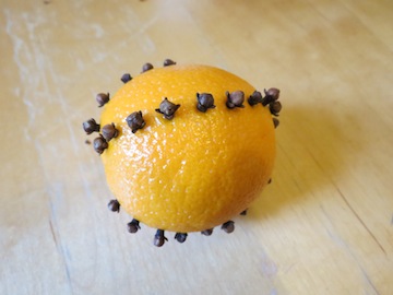 3. Put as many or as few cloves in lines up and down the orange as you like. We made the traditional four segments here, but you could experiement with two or three lines of cloves.