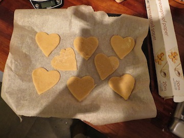 5. Dust a surface with flour and roll out the dough with a rolling pin. Take your heart cookie cutter and cut out your shapes.