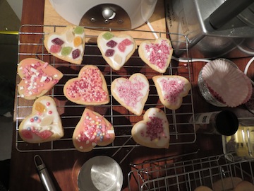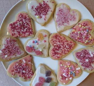 For the icing: 1 cup icing sugar (confectioners sugar) and 4 tsp water For the decorations: A heart-shaped cookie cutter 2 baking trays lined with greaseproof paper Pink, white, red sprinkles, or other candies Pink Food colouring (optional) |